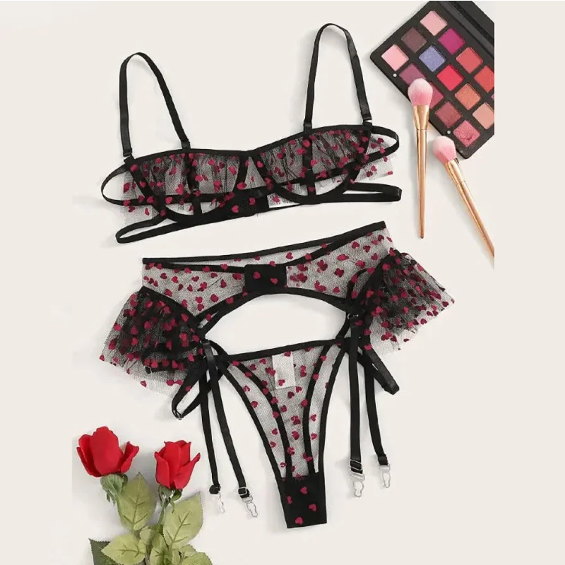 Zaprezentujmy Ci nasz wyjątkowy 3-elementowy komplet bielizny siateczkowej z motywem serduszek. Ten czarny zestaw, zawierający koronkowy biustonosz, seksowne stringi oraz pas do pończoch, idealnie nadaje się na randkę, walentynki czy imprezę. Wykończony delikatnymi falbankami, komplet charakteryzuje się miękkimi miseczkami i romantycznym wzorem w serca. Gotowa na niezapomniane chwile?
