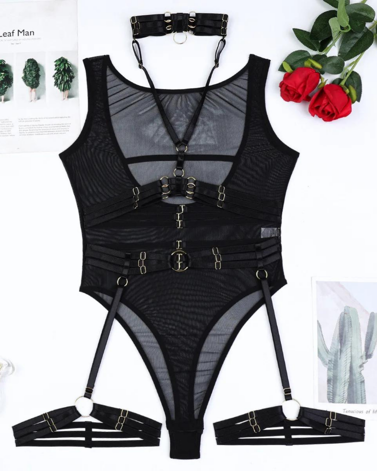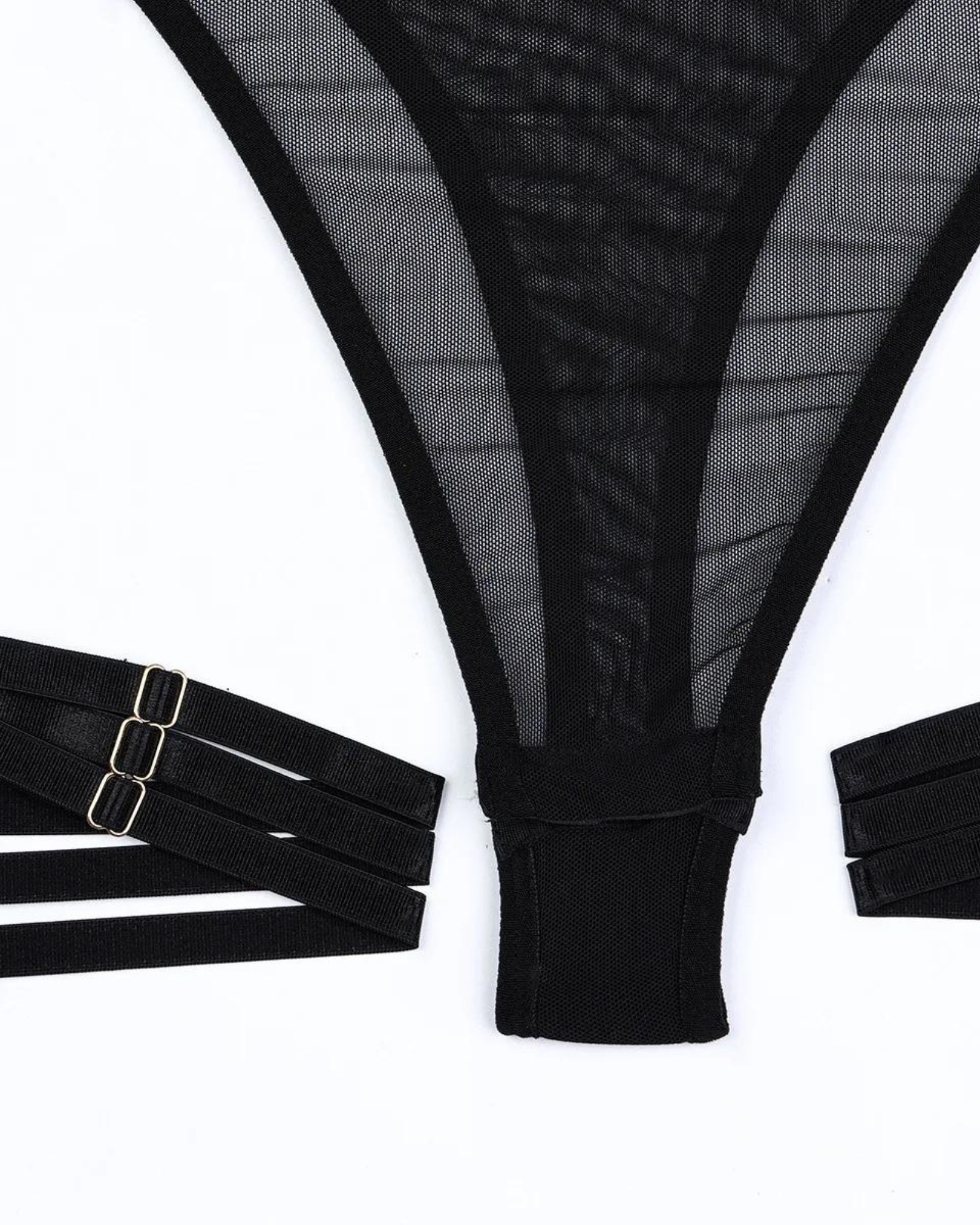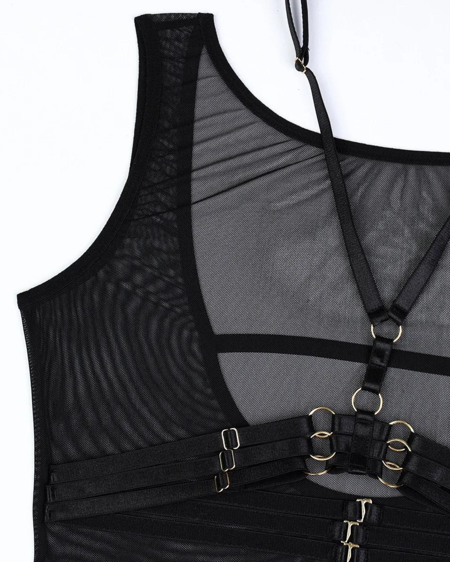 Wkrocz w świat elegancji i zmysłowości z tym niezwykłym body. Jego przezroczysty materiał doskonale akcentuje sylwetkę, nadając jej tajemniczy i kuszący wygląd. Zmysłowe paski z metalowymi detalami tworzą odważny i przyciągający wzrok design.