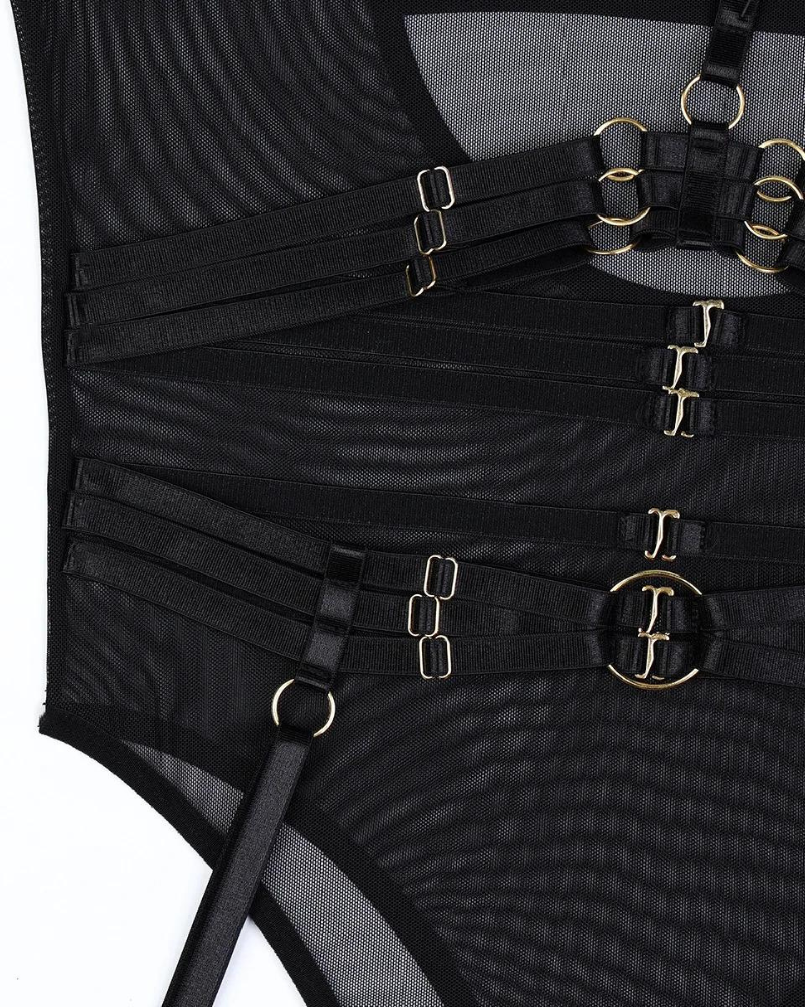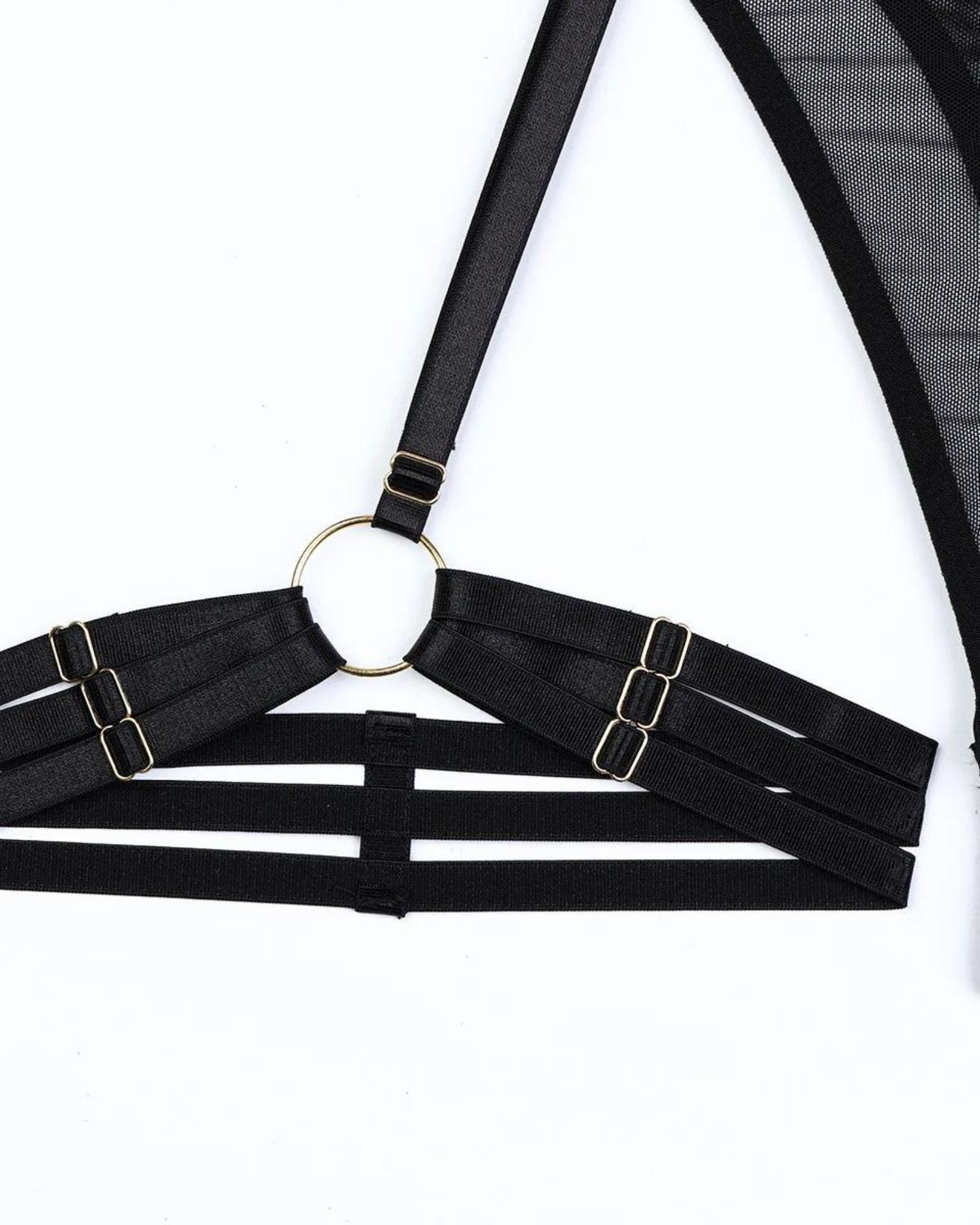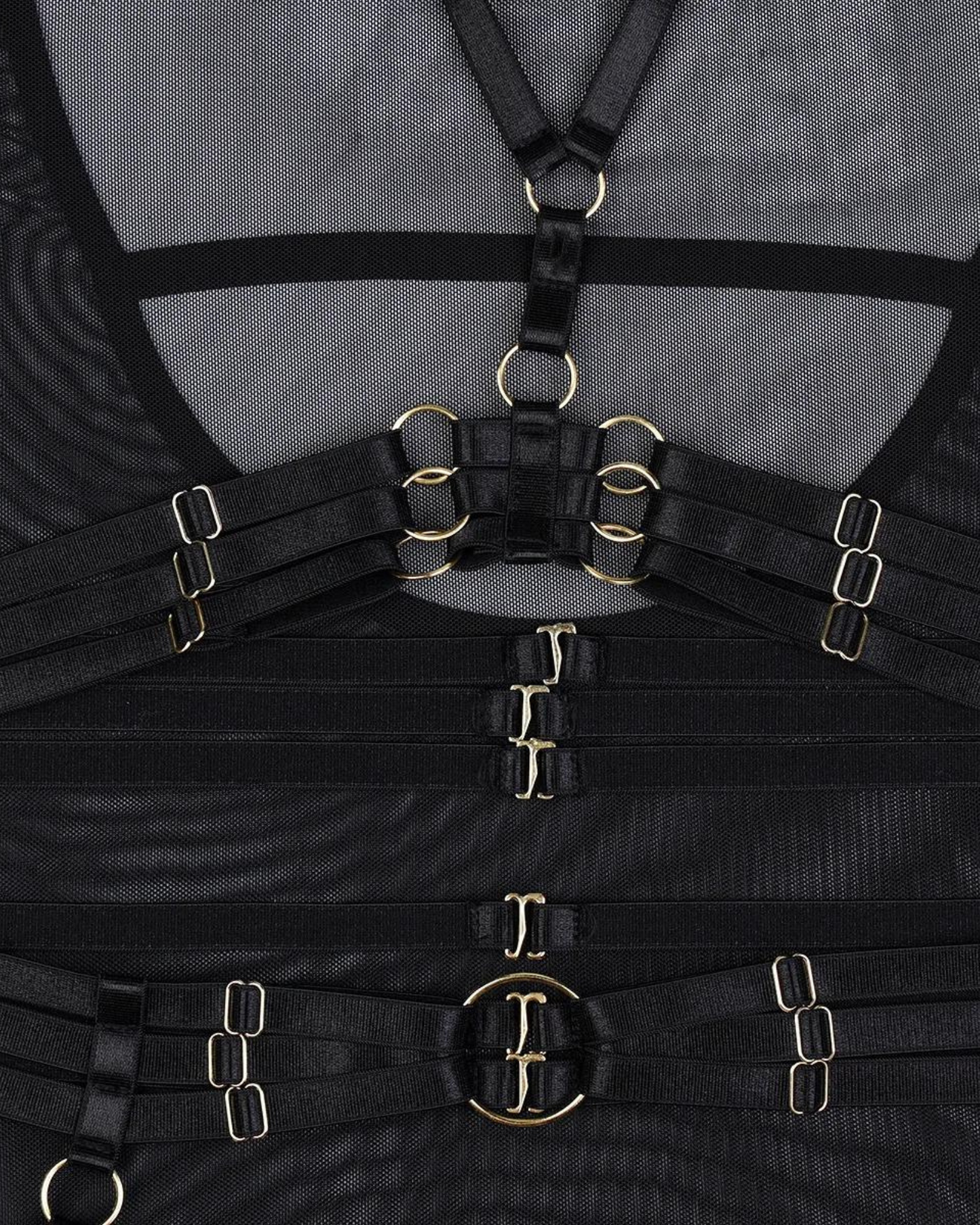 Wkrocz w świat elegancji i zmysłowości z tym niezwykłym body. Jego przezroczysty materiał doskonale akcentuje sylwetkę, nadając jej tajemniczy i kuszący wygląd. Zmysłowe paski z metalowymi detalami tworzą odważny i przyciągający wzrok design.