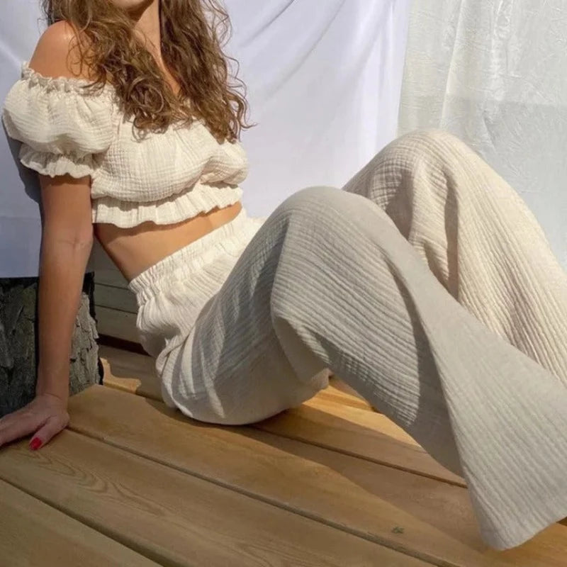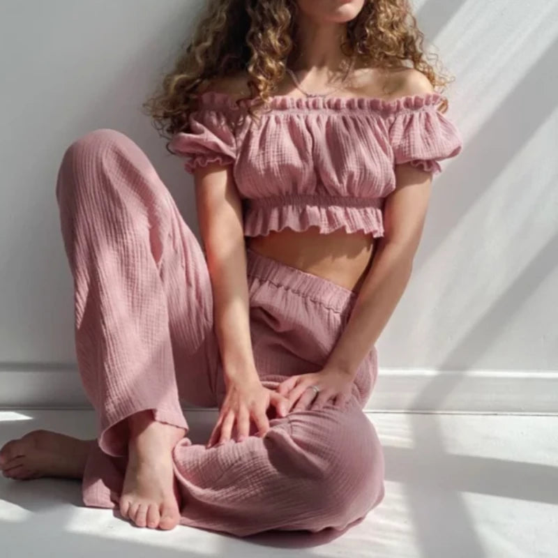 Poczuj się swobodnie w naszym komplecie piżamy! Ten komplet powstał specjalnie z myślą o każdej kobiecie, która ceni sobie wygodę i elegancję. Piżama składa się z krótkiego topu z odkrytymi ramionami i ozdobnymi falbankami oraz z długim spodni o prostym kroju z gumką w pasie. Skrojona w luźnym fasonie w stylu boho na pewno sprawi, że poczujesz się pięknie i komfortowo. Całość została wykonana z miękkiej bawełny, dzięki czemu będziesz miała pewność, że Twoja skóra oddycha a Ty masz na sobie materiał najwyższej jakości.