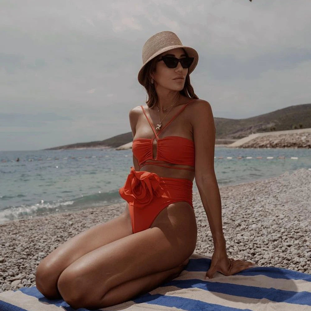 Odkryj idealny strój kąpielowy na nadchodzące wakacje! Nasz dwuczęściowy strój kąpielowy bikini wiązany z wysokim stanem w odcieniach czerwieni i bieli to doskonały wybór na plażę i letnie przygody. Charakteryzuje się gładkim wzorem, miękkim biustonoszem typu bardotka oraz majtkami z podwyższonym stanem, które gwarantują wygodę i elegancki wygląd. Ozdobne wiązania na szyi i subtelna róża na majtkach dodają mu unikalnego uroku.