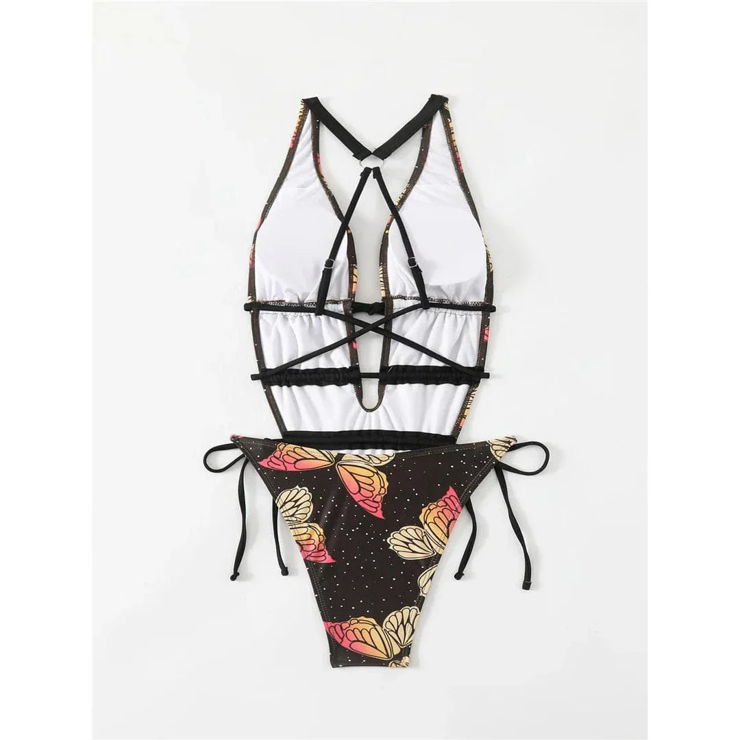 Ten jednoczęściowy kostium kąpielowy z motywem motyli to doskonały wybór na letnie dni, łączący elegancję z odrobiną szaleństwa. Odkryte plecy oraz głęboki dekolt sprawiają, że będziesz wyglądać olśniewająco na plaży lub basenie, a wiązania na biodrach i brzuchu umożliwiają perfekcyjne dopasowanie do Twojej figury.