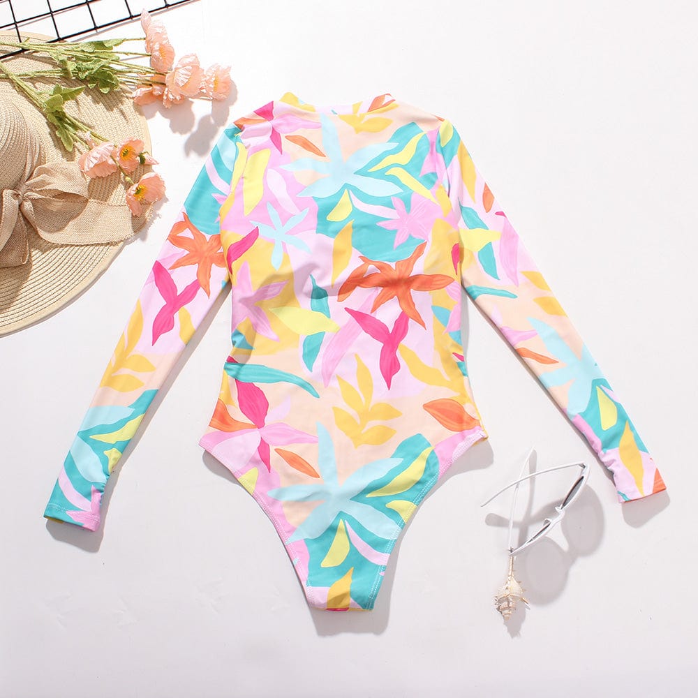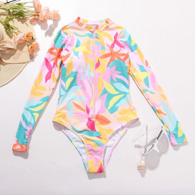 Wyraź swój styl na plaży dzięki temu jednoczęściowemu kostiumowi kąpielowemu, który łączy funkcjonalność z modnym designem. Długi rękaw oraz wielokolorowy wzór sprawią, że będziesz wyglądać wyjątkowo, a zapięcie na suwak ułatwi Ci przygotowanie do kąpieli.