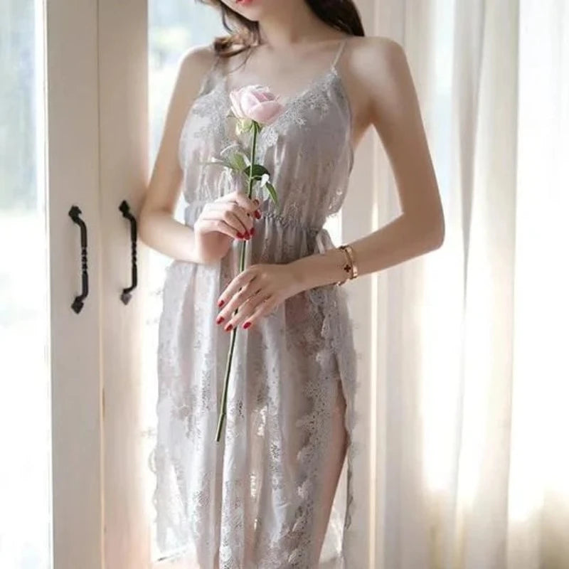 Oto koronkowa romantyczna koszula nocna, która zapewni Ci niezapomniane chwile zarówno podczas ślubu, randki, walentynek, jak i podczas relaksującego snu. Wybierz spośród różnorodnej gamy kolorów, od białego po czarny, aby podkreślić swój własny styl. Z dekoltem w kształcie litery "V", ramiączkami i mini długością, ta koszula nocna jest idealnym połączeniem elegancji i subtelnej seksualności, a dodatkowe wiązanie na dekolcie oraz rozcięcia po bokach dodają jej niepowtarzalnego uroku.