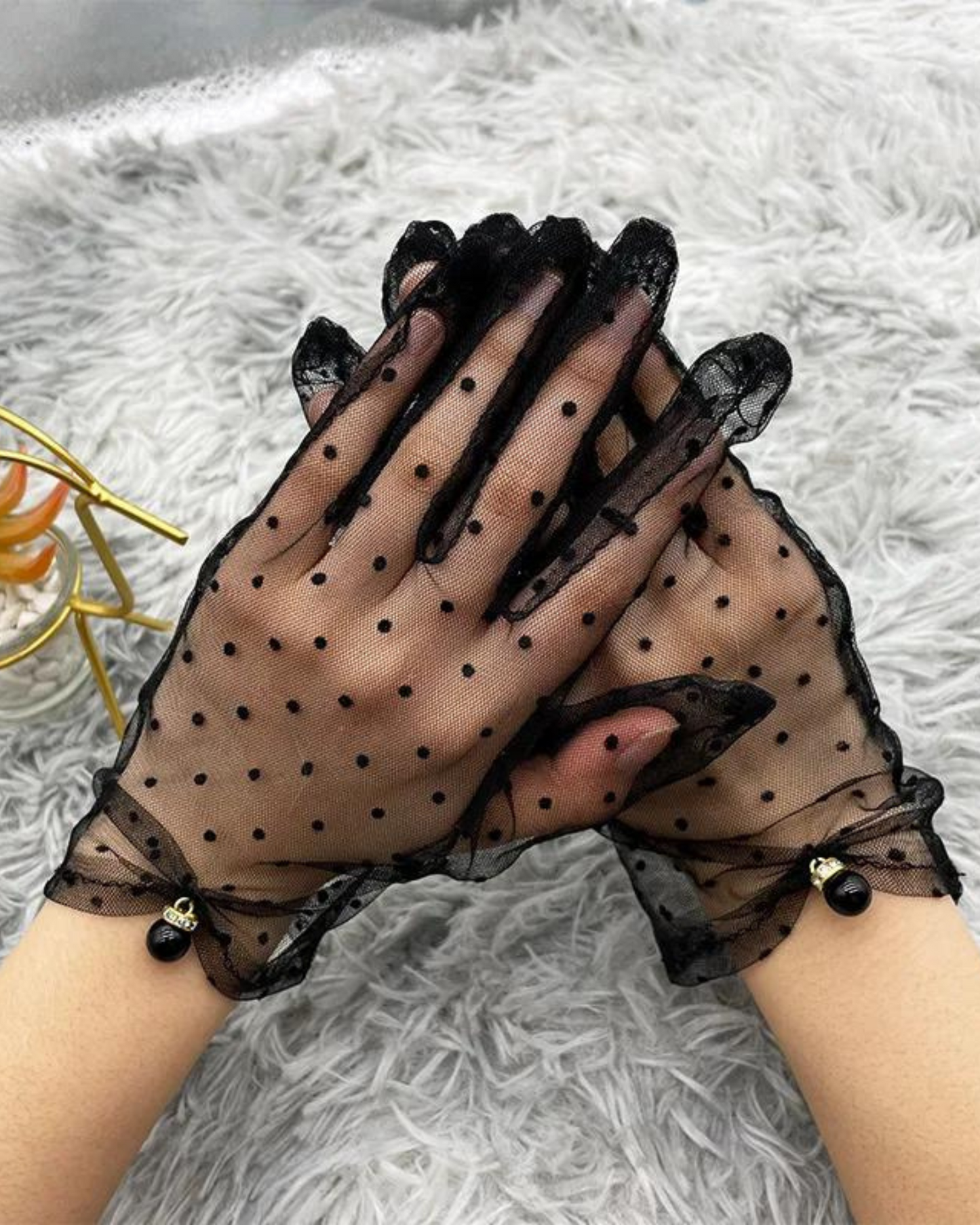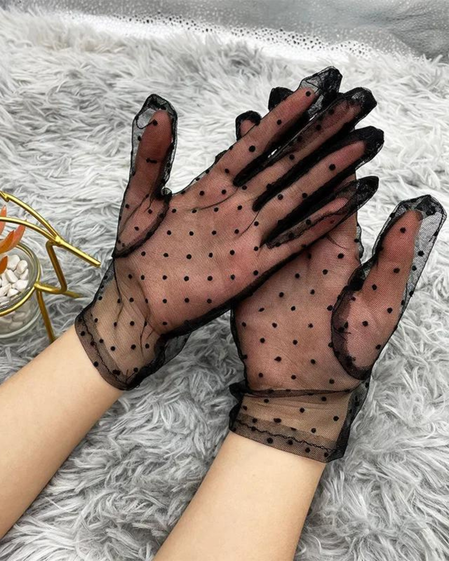 Przenieś się w świat luksusu i elegancji z tymi zmysłowymi rękawiczkami. Ich delikatna siateczka, ozdobiona subtelnymi kropeczkami, wspaniale podkreśli Twoją kobiecość.