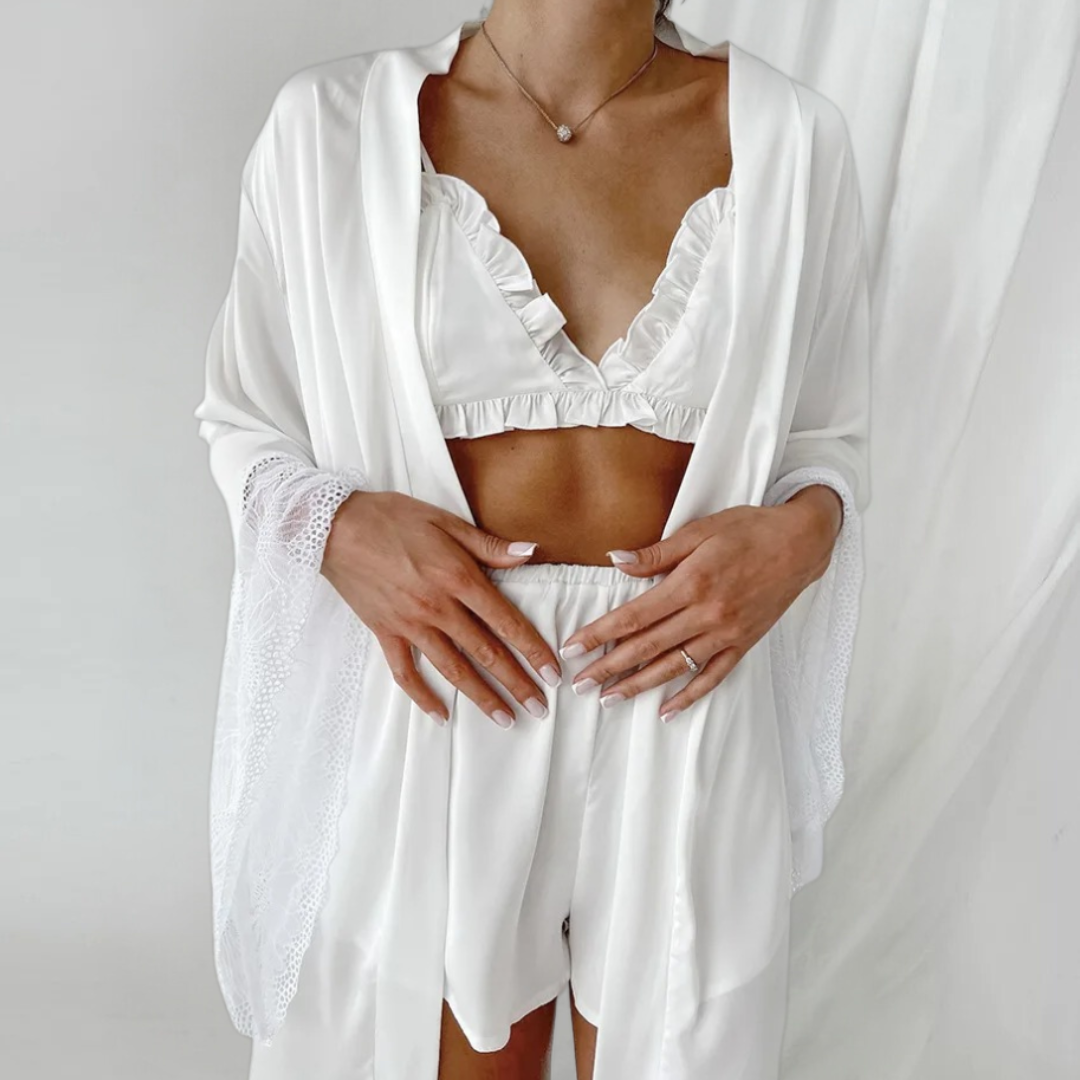 - Stylowy zestaw - łączy w sobie biustonosz, szlafrok i spodenki, tworząc harmonijną całość.