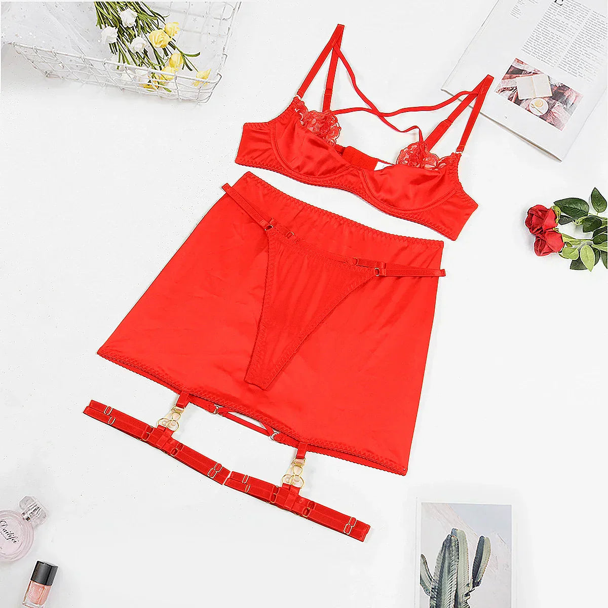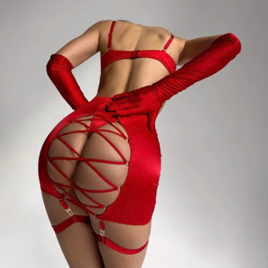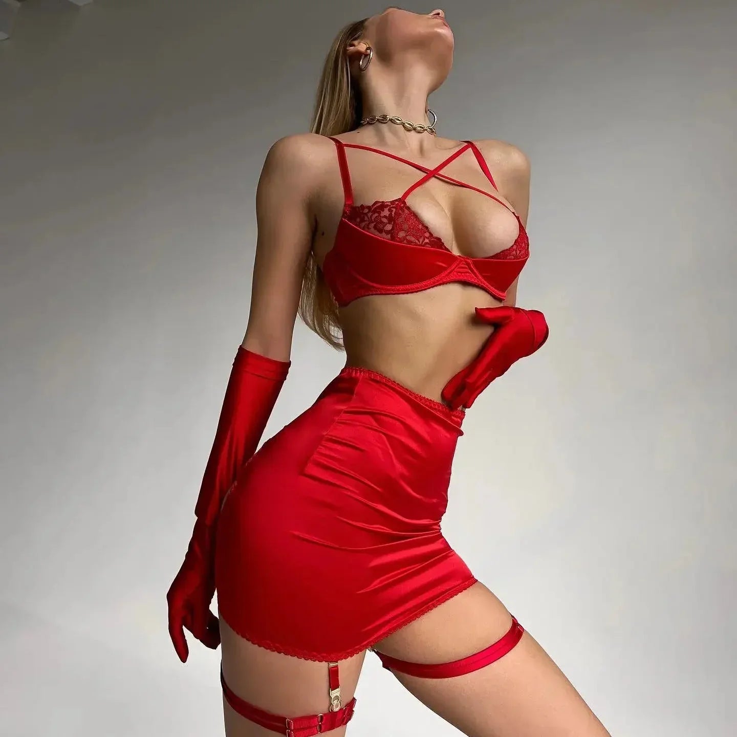 - Kompletny zestaw - zawiera biustonosz, stringi, spódniczkę i podwiązki